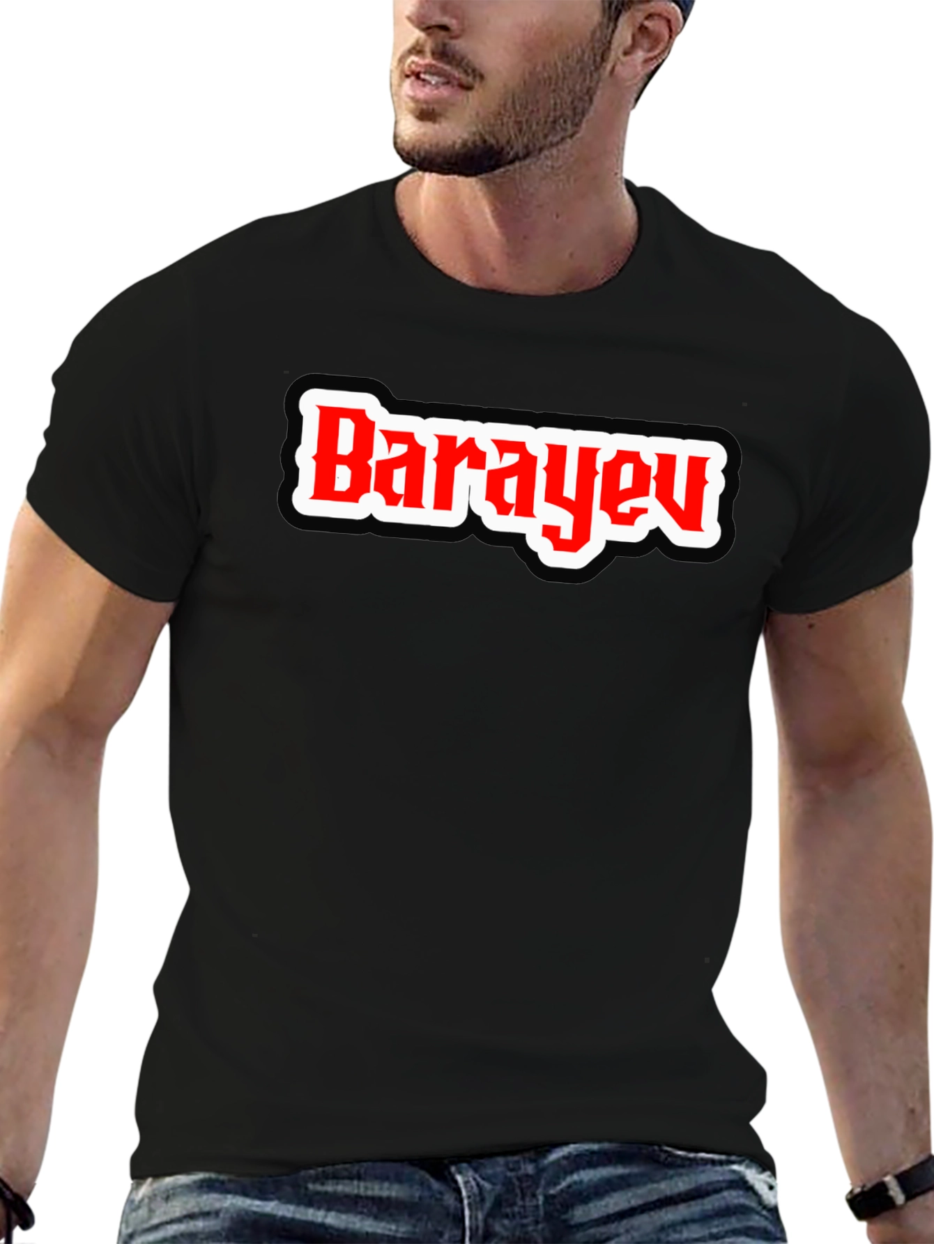 Make a statement with this eye-catching black t-shirt featuring a bold graphic print. The word "Barayev" is prominently displayed in a red, stylized font with a contrasting white and black outline, ensuring maximum visibility. This classic tee is made from a comfortable-looking fabric, likely cotton or a cotton blend, providing a soft feel and relaxed fit. Perfect for casual wear, this t-shirt is ideal for expressing your unique style. Wear it with jeans, shorts, or layer it under a jacket for a versatile look. Show off your individuality with this distinctive graphic tee!