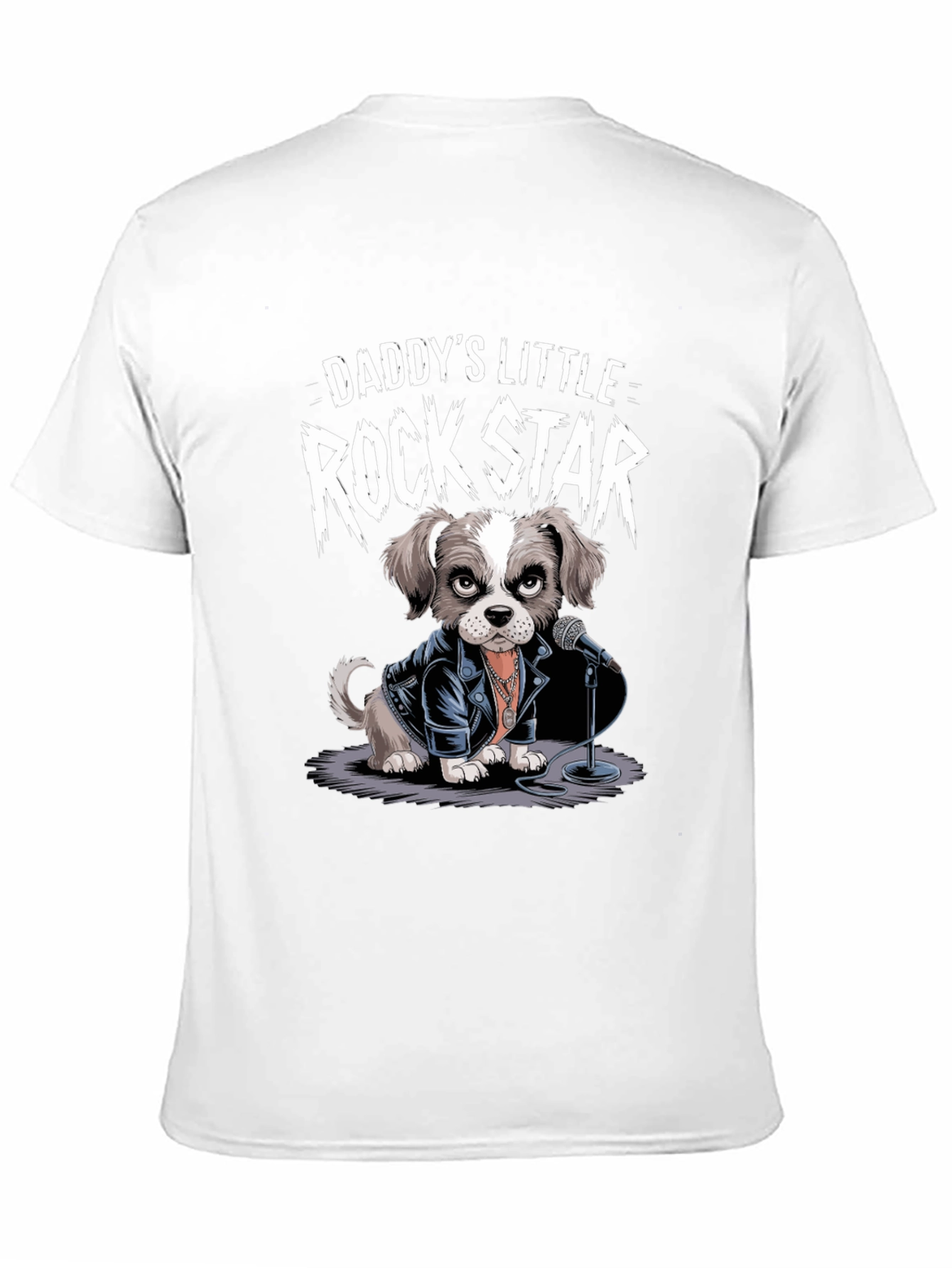 Rock out with this adorable Daddy's Little Rock Star T-Shirt! This black tee features a cool cartoon dog wearing a leather jacket and standing by a microphone, ready to sing his heart out. The design is sure to turn heads and bring a smile to anyone's face. Made from comfortable materials, this shirt is perfect for casual wear or for showing off your love for music and dogs. Whether you're attending a concert, hanging out with friends, or just relaxing at home, this shirt is a great choice. Get yours today and let the world know you're a rock star!