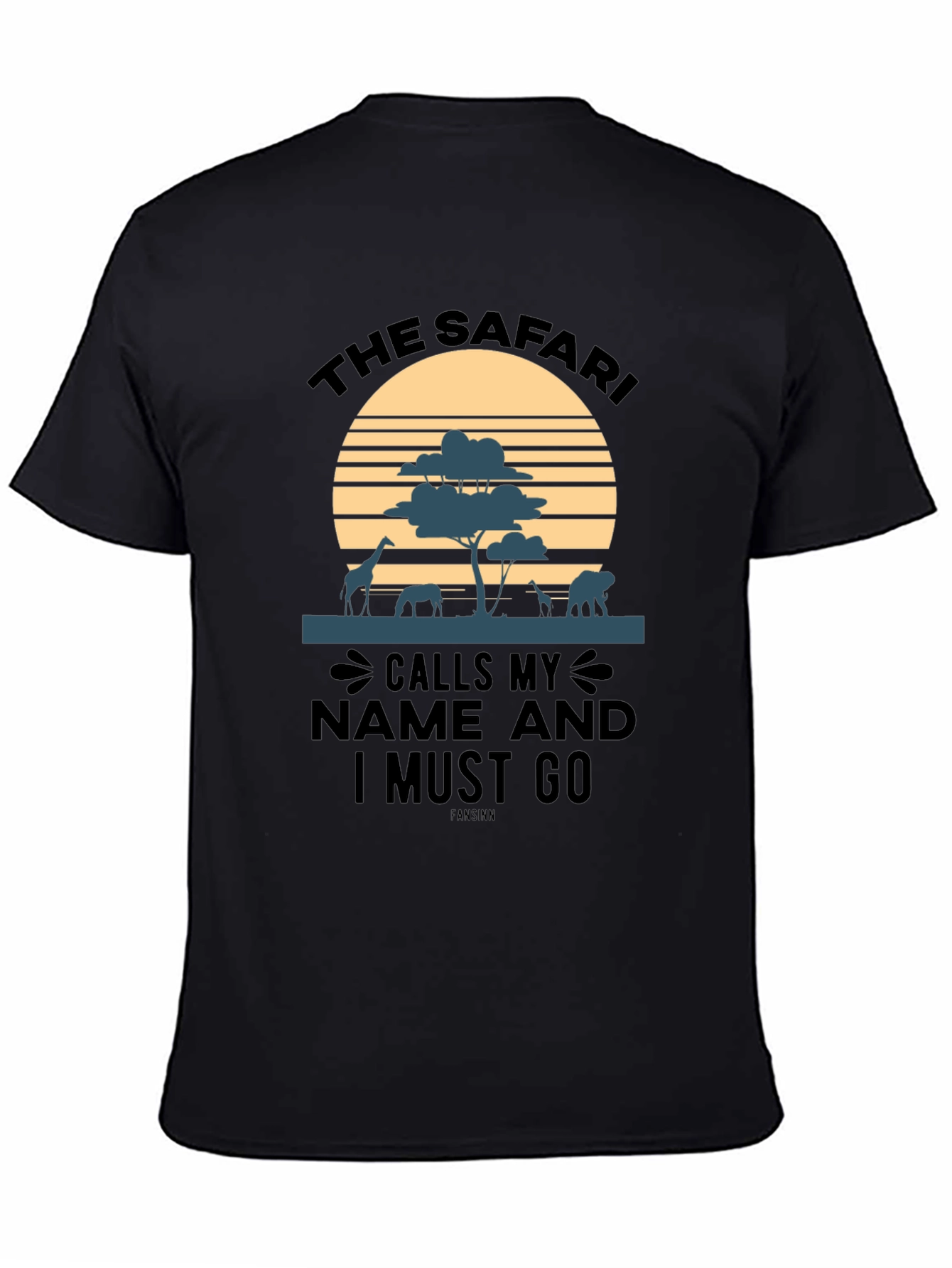 Embrace your wild side with this stylish black t-shirt featuring a captivating safari sunset design. The print showcases silhouettes of giraffes, elephants, and trees against a warm, striped sunset backdrop. Bold text proclaims, 'The Safari Calls My Name and I Must Go', perfect for adventure enthusiasts and travel lovers. Crafted from a soft, comfortable fabric, this tee is ideal for casual outings, weekend explorations, or simply expressing your passion for wildlife. Make a statement and let your adventurous spirit shine!