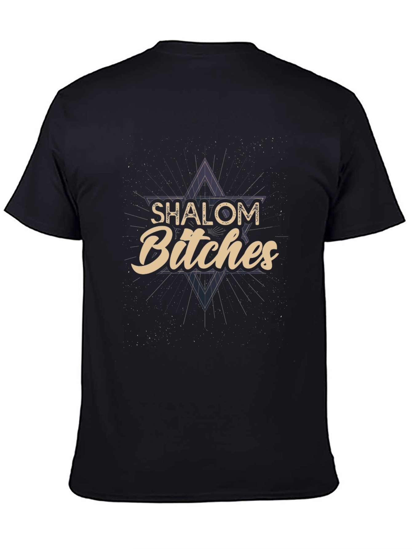 Make a statement with this bold and unique graphic tee. The black shirt features a Star of David design with the text "SHALOM Bitches" overlaid in a stylish font. This eye-catching design is sure to turn heads and spark conversations. Perfect for casual wear, parties, or expressing your unique sense of humor. This tee is a comfortable and expressive addition to any wardrobe. Wear it with jeans, shorts, or a skirt for a standout look. This tee is a must-have for those who love to express their individuality.