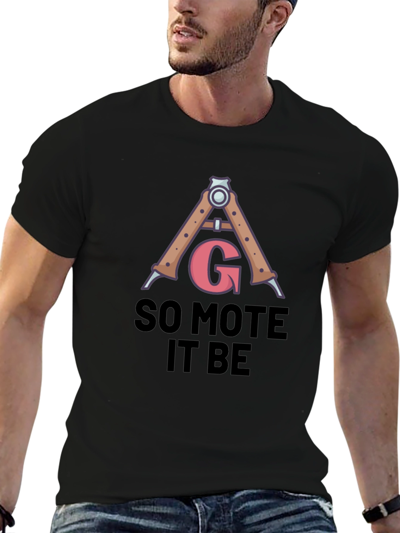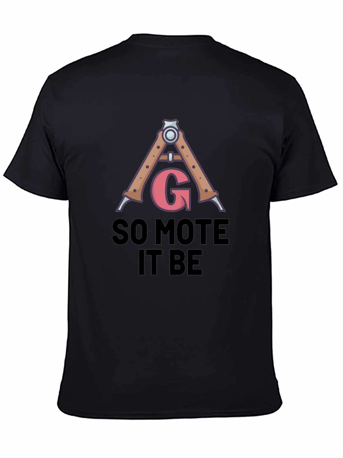 Show off your style with this unique black graphic t-shirt. Featuring a compass graphic with the letter "G" and the phrase "So Mote It Be", this tee offers a blend of classic design and modern appeal. The shirt appears to be made from soft, comfortable material, perfect for everyday wear. Dress it up with a jacket for a night out or keep it casual with jeans for a laid-back look. A great conversation starter for those with an interest in symbolism and unique fashion. Add this eye-catching tee to your wardrobe today!