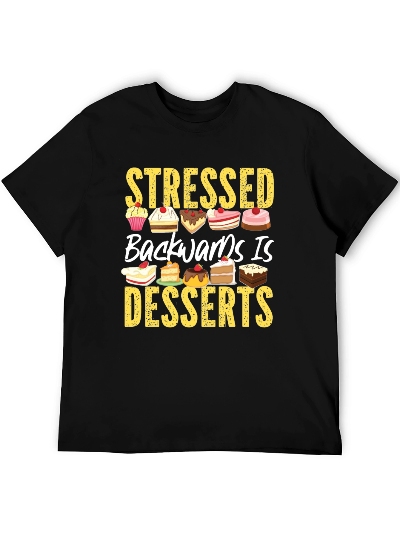 Indulge your sweet tooth and sense of humor with this stylish black T-shirt. Featuring a clever design that reads "Stressed Backwards Is Desserts" in eye-catching yellow lettering, complemented by delightful illustrations of various cakes and sweets. This comfortable tee is perfect for casual wear, baking enthusiasts, or anyone who appreciates a good pun. Made from a soft, breathable fabric, it ensures all-day comfort. A fun and unique addition to your wardrobe, this shirt is sure to spark conversations and bring smiles wherever you go. It's also a great gift idea for the dessert lover in your life. Treat yourself!